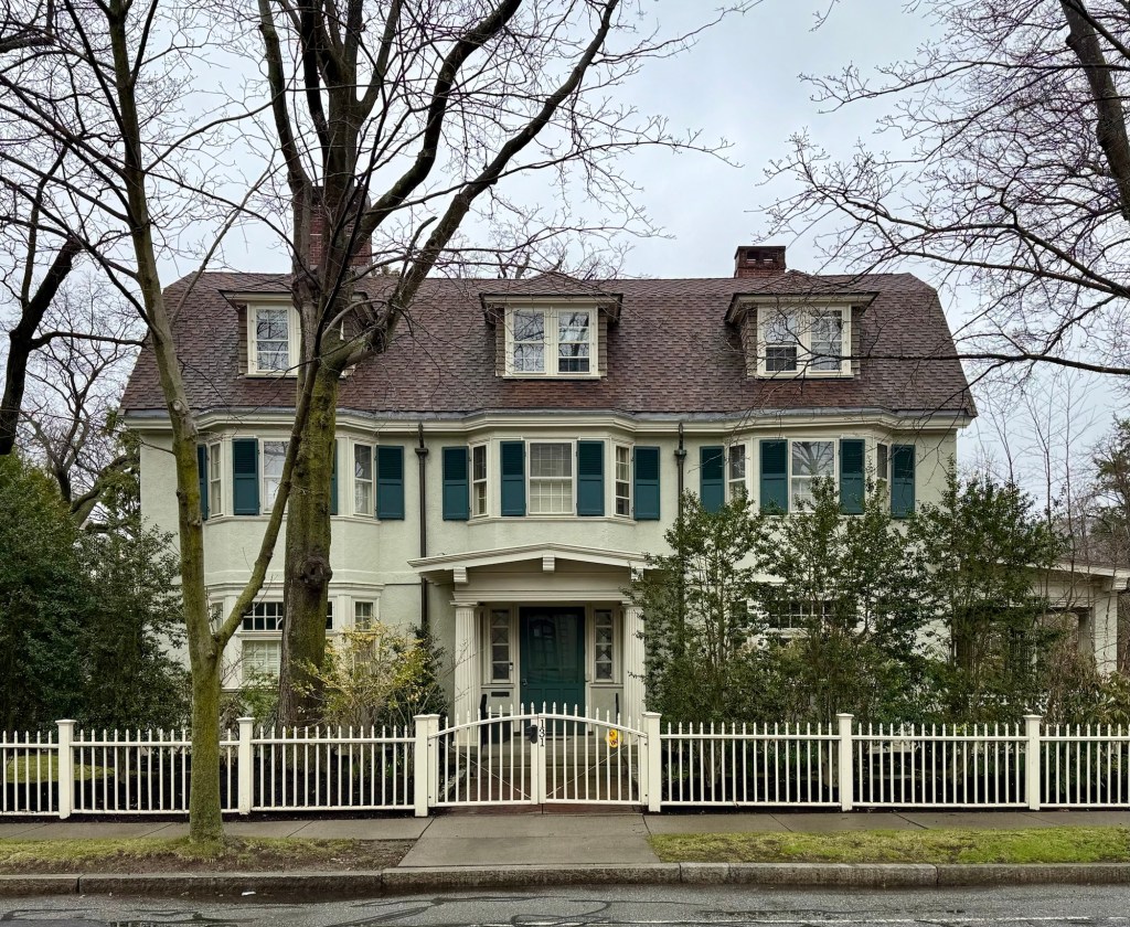 Built in 1911, this Colonial Revival style house rendered in stucco, is located at 28 Hawthorn Road in the Pill Hill neighborhood of Brookline, Massachusetts. The residence was built for William Marshall Warren (1865-1953) and his wife, Sara Shields Warren (1874-1964) from plans by the firm of Gay & Proctor. William M. Warren served on the faculty at Boston University as Professor of Philosophy and later as Dean of the College of Arts and Sciences, promoted by his father, William Fairfield Warren, who was President of the University. The Warren House features a symmetrical five-bay facade with central entrance within a projecting pedimented vestibule framed by four pilasters. The pilasters are replicated in the three dormers at the roof, set below the central chimney.