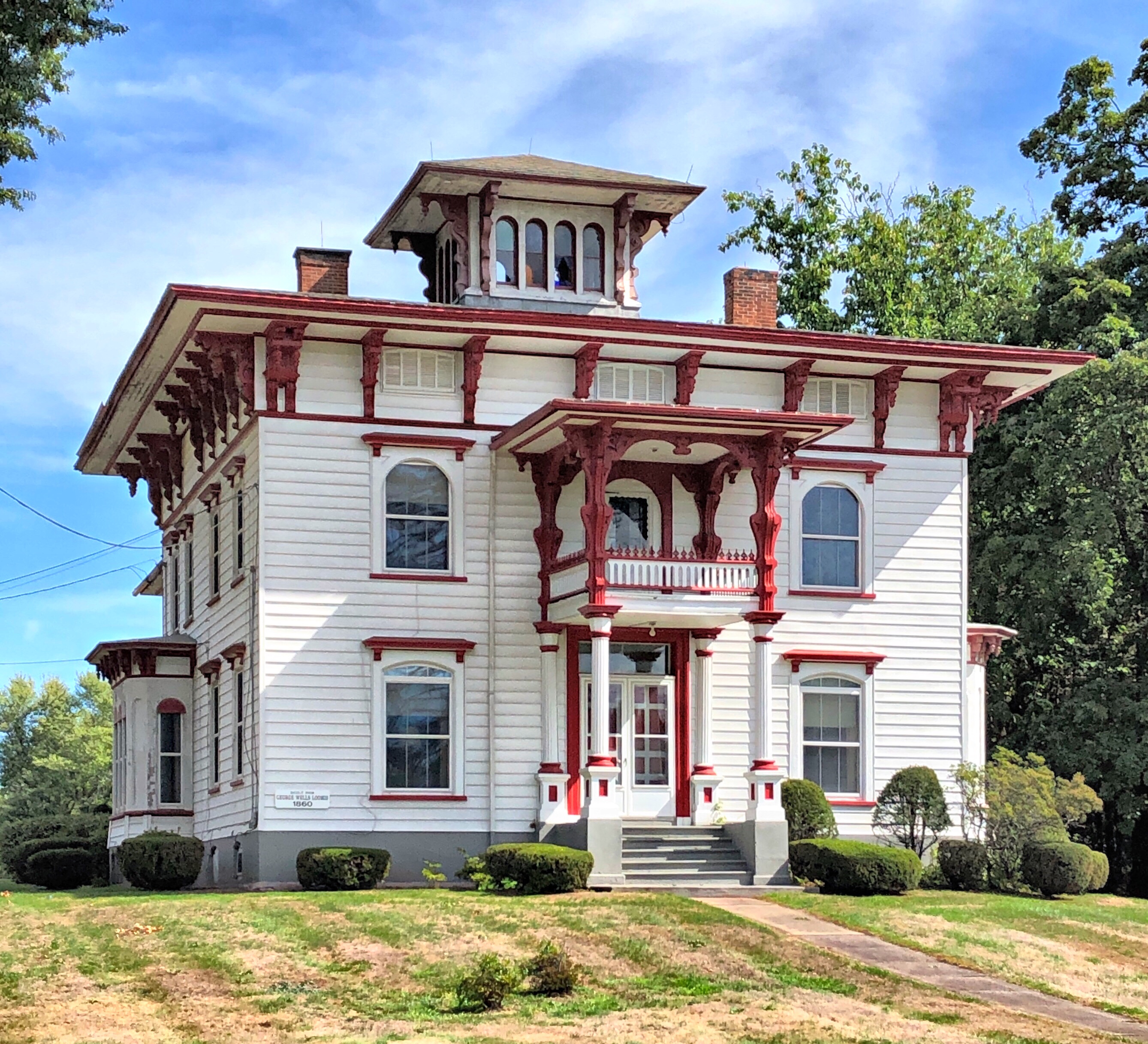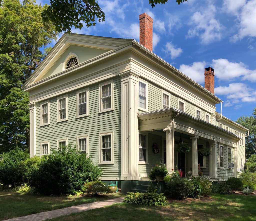 This large Italianate mansion on Main Street in Suffield was built in 1860 by John Wells Loomis for his son, George. George ran a cigar shop in a separate building on the lot, selling rolled cigars that his family harvested and rolled. The mansion features a belvedere atop the low sloped hip roof with broad overhanging eaves. John Loomis’ home is a couple lots away.