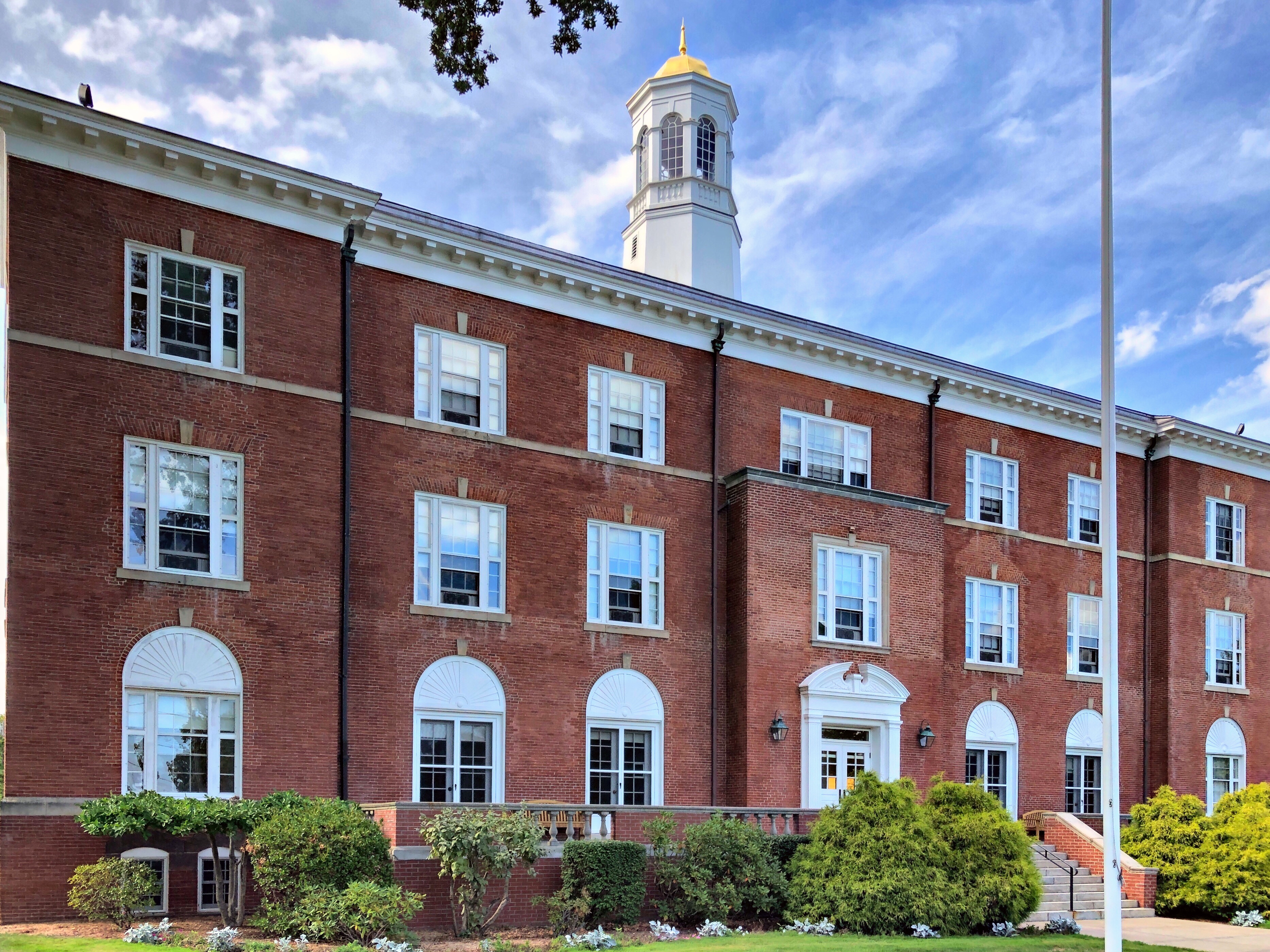 Initially established as the Connecticut Literary Institute (the school was renamed Suffield School in 1916 and then Suffield Academy in 1937), the mission of this school with Baptist roots was to educate young men for the ministry. As the Connecticut Literary Institute was the only high school in Suffield, the town tax dollars paid for local students to attend. Although town and local Baptists served a major role in getting the school underway, the founders soon moved away from a denominational focus. Built for the Institute in 1854, this large brick academic building was designed in the Italianate style with brackets and decorative brickwork at the cornice. In 1950, the school “Colonialized” the campus beginning with the Memorial Building, removing the Victorian flair for a more traditional Colonial Revival appearance. They also did the same with Fuller Hall next door.