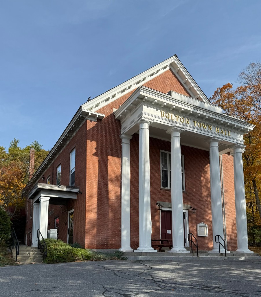The Town Hall building in Bolton, Massachusetts, is significant as the hub of the town’s municipal activities for the past century and a half and architecturally as a mid-19th century town hall built in the transitional Greek Revival and Italianate styles. The structure was completed by the town in 1853 as a replacement for the former 1834 wood-frame town hall, which had burned down in 1851. The original wood-frame building was constructed at the time that municipal functions were being moved out of town meetinghouses across Massachusetts following the desire to separate church and government functions. Like many town halls of its era, the larger 1853 building was designed to accommodate multiple aspects of the community’s institutional and public life. The two-story building included a fireproof vault for town records, with town meetings held in the second floor meeting hall, with selectmen meeting in a room on the first floor. A small room was fitted for a library until the early 20th century when the town’s first purpose-built library was constructed farther down Main Street. The fairly unadorned Town Hall was modernized in around 1916 with the addition of the front portico and a rear addition. The Bolton Town Hall remains as a source of pride for the small, yet charming town of just under 6,000 residents.
