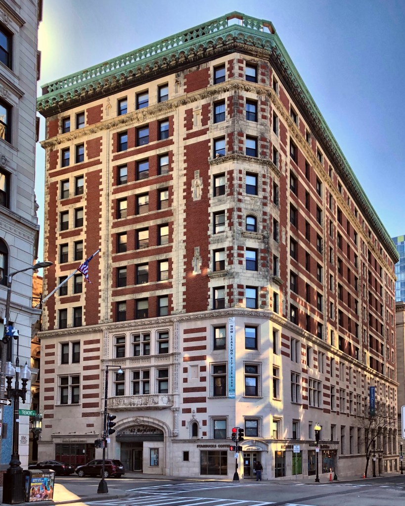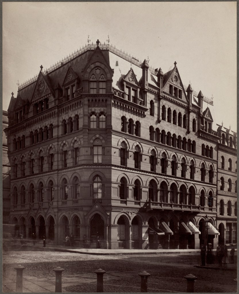 Built in 1857 at the prominent intersection of Boylston and Tremont streets in Boston, the Hotel Pelham is said to have been the first apartment building of its type in America. Seen as a high-end apartment building, not like the slum-like tenements in New York and elsewhere in Boston, the units were like French-flats for medium-term renters, rather than short-term stays. The Hotel Pelham was developed by Dr. John Homer Dix, a doctor who took a keen interest in providing healthy accomodations for city-folk. The Hotel Pelham was designed by architect Alfred Stone, as an early example of the Second Empire style, with a French Mansard roof and stone facades. Just about a decade after the building was completed, Tremont Street (which runs along the side of the building) was set to be widened. This work would require the partial (and likely full) demolition of the Pelham Hotel. Rather than see his building face the wrecking ball, Dr. Dix, in 1869, had the Hotel Pelham slid off its foundation, and moved westward thirty feet to accommodate the expanded Tremont Street. This incredible feat of engineering was undertaken by John S. Blair, with architect Nathaniel Bradlee overseeing updates to the facades and interiors. The building would survive a gas main explosion in 1897, but succumbed to redevelopment during WWI, when the building was demolished for the present building on the site, the Little Building.
