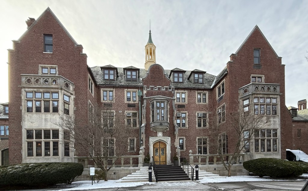 This handsome, and unique example of a three-decker in the English Revival style is located on a corner lot at 128 Davis Avenue in the Emerson/Brookline Village neighborhood of Brookline, Massachusetts. Built in 1904 from plans by architect and genealogist, J. Gardner Bartlett, whose work focused on colonial New England and the English origins of colonial families. Trained as an architect at MIT, he gave up architecture for genealogy, but still occasionally designed buildings in the Boston area. The building here was developed for Richard Graham, an Irish immigrant, who along with his wife, operated a laundry business in the village. The use of a shingle and stone entrance porch and entrance bay with stucco half-timbering and diamond-pane casement windows stand out architecturally as one of the few examples of a three-decker built in this style in New England.