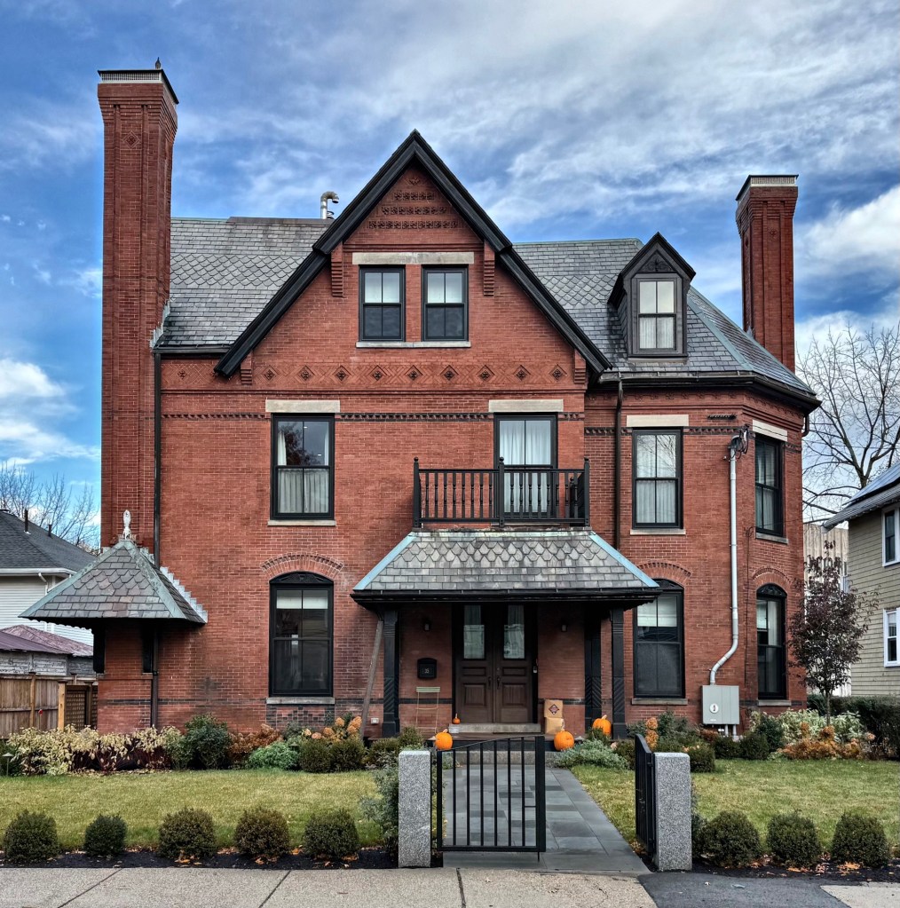 Elijah Carleton Emerson (1807-1888) was a wealthy Boston merchant, making his fortune as Director of the Second National Bank and President of the Middlesex Horse Railroad. In his late 30s, he purchased land in Brookline Village and established his estate on the land that is now Emerson Park in 1846. The bucolic setting of his estate included a pond, boathouse and adjacent cottage, but as the surrounding area continued to develop with easy access to Downtown Boston, Elijah Emerson began to develop his estate. Emerson began to build residences on his land for supplemental income. This handsome Stick style double-house was built around 1880 and rented by Mr. Emerson and was eventually occupied by his granddaughter, Tirzah and her husband, George Francis Arnold. The residence features a mansard roof, decorative brackets and applied stickwork, and a handsome porch with turned posts.