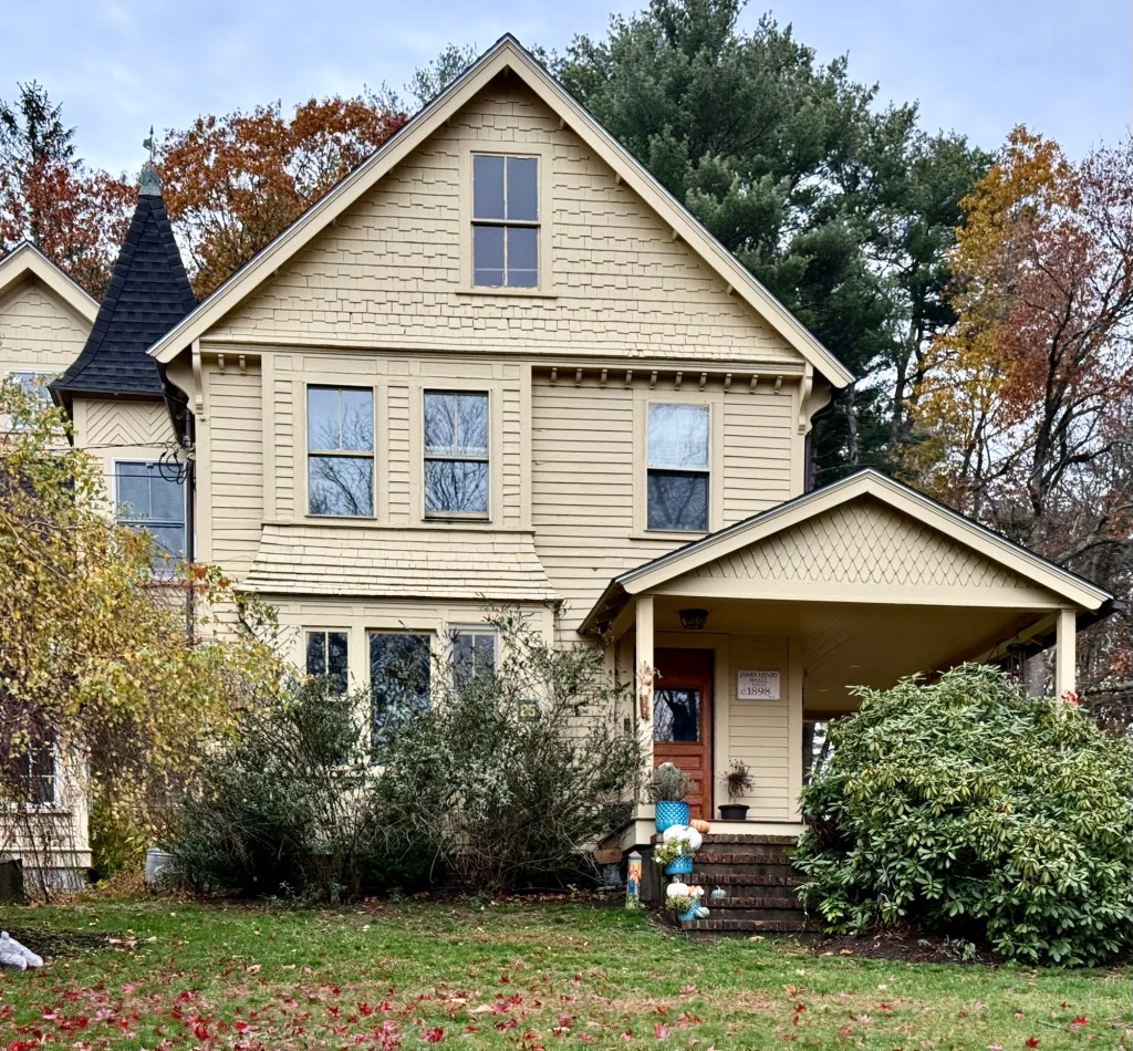 After the completion of the Wayland Railroad Depot in 1881, suburban development in Wayland Center increased, where the village saw dozens of large homes built in the late 19th and early 20th century. On Bow Road, the James H. Small House was built around 1898 by and for its namesake, who worked as a carpenter and builder in town. James Henry Small (1847-1913), while not a trained architect, built this home as a late example of the Queen Anne style, as the Colonial Revival style began to proliferate in the village, showing a changing of architectural taste. The James Small House consists of a main gable-front block with a side wing that includes a square tower. The use of clapboards, differing shingles, and diagonal sticks provide variety and texture to the house and serves as a unique contribution to the village which is largely dominated by rigid symmetry and vernacular of Colonial-era homes.