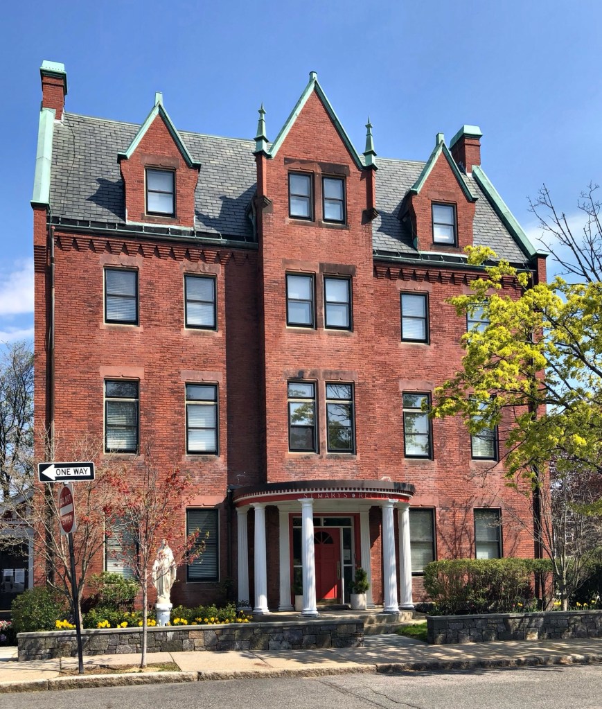 Located adjacent to the St. Mary of the Assumption Catholic Church in Brookline Village, this handsome three-and-a-half-story brick structure has served as the Rectory of the congregation since it was built in 1882. Complimenting the Victorian Gothic style of the church next door, the Rectory was also designed by the firm of Peabody and Stearns, and was the home of the priest and other high-ranking clergy men. The rectory stands out architecturally for its panel brick corbelling at the eaves, steeply pitched slate roof and copper-coated gables.
