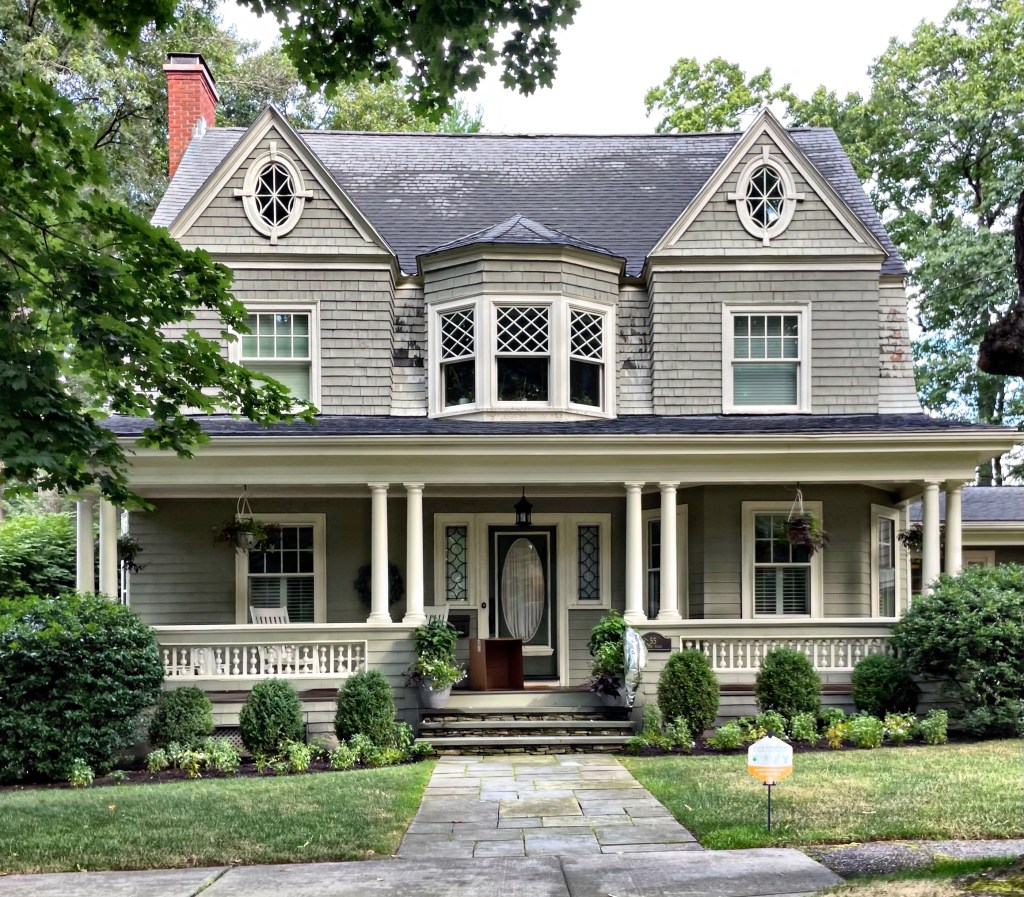 In 1895, when the Queen Anne style was no longer in vogue among architects and builders in the Boston area, the Allston Real Estate Company took a gamble and built this house in a scarcely developed section of Waban Village in Newton on spec, hoping to find a buyer. They found one in Oscar Raymond Rice and his wife Maud Lois Sargent Rice. Oscar worked as a salesman, and Maud volunteered locally with various causes. The family home is a great example of Queen Anne Victorian architecture with varied siding styles, asymmetry, a tower, rounded bay window, porch with turned posts, and applied decoration in the gables. The house underwent a large renovation about five years ago and it still looks great! The listing from 2017 gives me serious house envy.