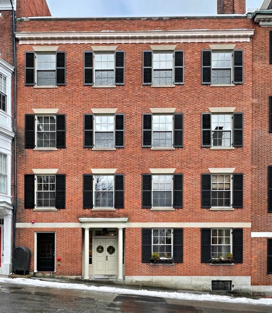 Built in 1856, the townhouse at 2 Walnut Street is a unique Second Empire style townhouse erected on one of the last undeveloped lots on the South Slope of Boston’s exclusive Beacon Hill neighborhood. The three-story, brick residence is capped by a mansard roof and its facade is dominated by a full-height octagonal bay, which at the center on each floor, is a recessed brick panel in lieu of windows. The property was originally owned by Henry Sturgis Grew (1834-1910) a real estate developer and politician who split his time between this residence and a large estate called Grew’s Hill, that grew to several hundred acres and contained an active farm, part of which was later incorporated into Stony Brook Reservation. Henry Grew’s daughter, Jane Norton Grew, would go on to marry John Pierpont Morgan Jr. (J. P. Morgan) in 1890. The Grew House was modernized in the 20th century with a Classical door surround, but otherwise, it maintains the appearance of when it was built in 1856.