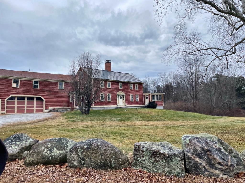 One of the oldest homes in Weare, New Hampshire is this large, Georgian farmhouse apparently constructed around 1767 by Samuel Bailey. Samuel’s father, Ebenezer Bailey, had purchased a property called “Lot 54, Range 1” in Weare, New Hampshire, which he then divided among his sons, Daniel, Samuel and Ebenezer Jr. for their own settlement in about 1767. Samuel received this lot in South Weare, upon which, the twenty-two-year-old and his wife established a farm and a family of at least eight children. Samuel died in 1824 and the farm was inherited by his son, Amos Wood Bailey, who continued operations here. Today, the large five-bay Georgian farmhouse is connected to a massive barn. It is a really spectacular property.