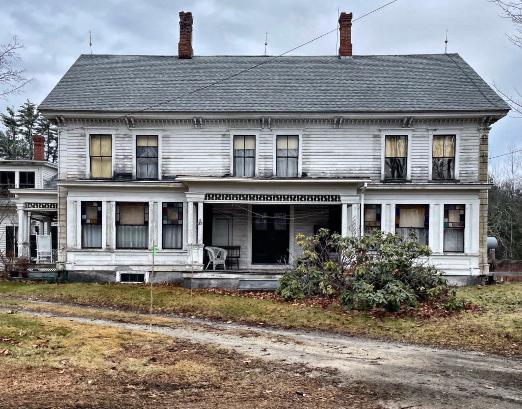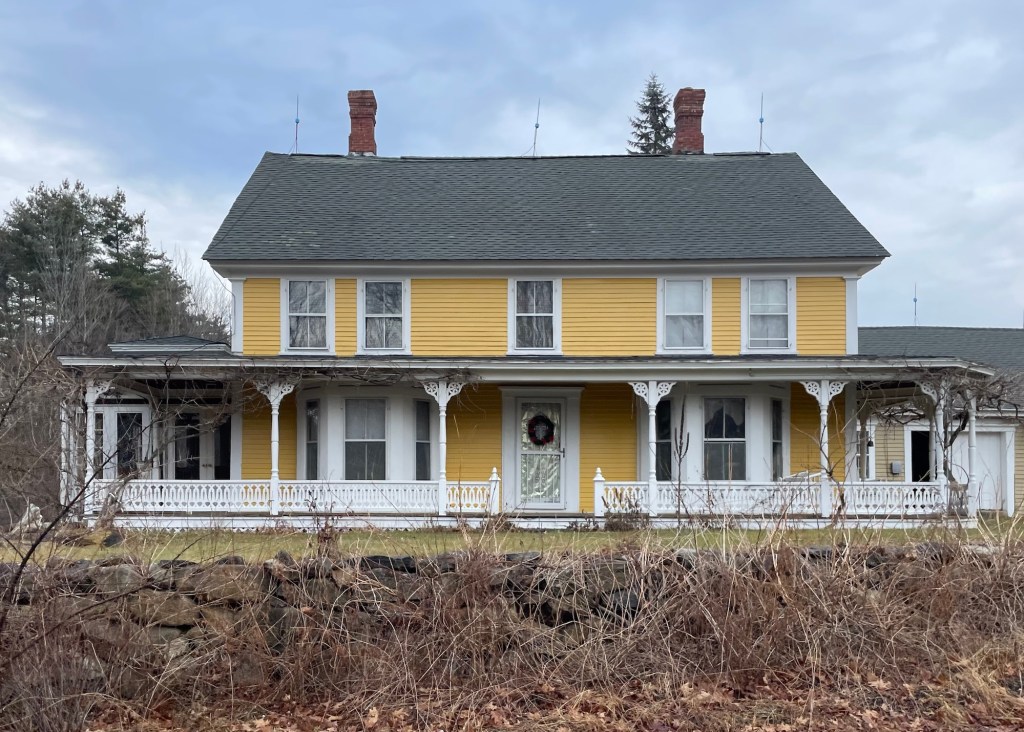 The backroads of New England always lead you to great discoveries! This time, driving around Weare, New Hampshire, I stumbled upon this large farmhouse on the side of the road. The home was owned by Cyrus Hazen by 1858 and due to its style, I would date it to be built in the 1850s. Cyrus Hazen married Louisa Bartlett (as her second marriage) in 1847 and they appear to have had this home built a few years later. The Hazen’s ran a farm from this home for decades. Sometime after the Civil War, the home would have gotten the full-length verandah (front porch) and a side tower, both Victorian-era additions. The home is now attached to the historic barn by an ell.