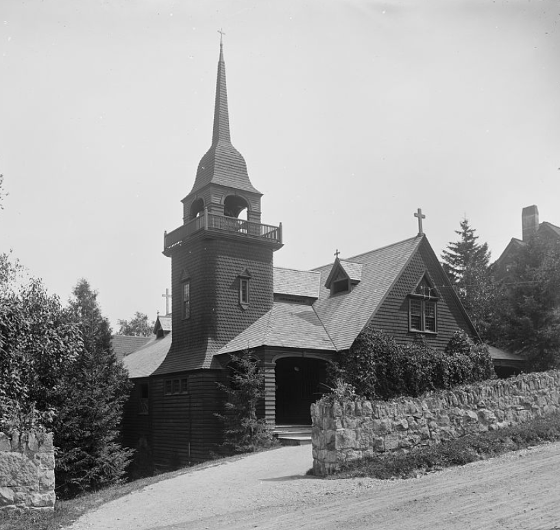 As wealthy citizens from cities like Boston, Philadelphia and New York, began building summer cottages on Mount Desert Island in Maine, an influx of carpenters and tradespeople from Ireland followed to construct and work on them. Realizing this, cottager DeGrasse Fox along with Brooks White of Philadelphia, donated land for a new Catholic church building. Maine architect, William Ralph Emerson, donated plans for the church. A masterpiece of Shingle style design, the church, which seated 300 people, was deemed too small for the growing village’s summer congregation. A new, stone church was built closer to town (featured previously). The spire and belfry resemble another church Emerson designed in Beverly, MA, St. Margaret’s Catholic Church. Sadly, St. Sylvia’s burned down in 1909.