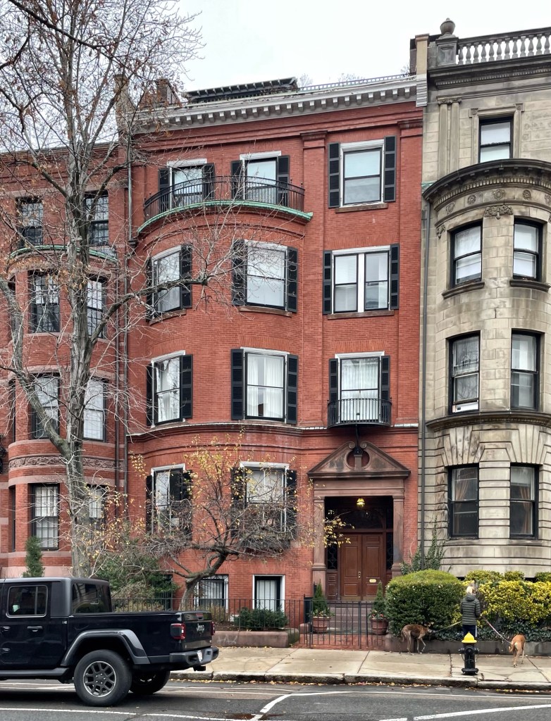 Hasket Derby (1835-1914), was the grandson of Elias Hasket Derby, a prominent trader in Salem, MA., who was thought at one time to be the richest man in the United States. Hasket married Sarah Mason and the family lived in Boston. Dr. Hasket Derby was a renowned opthamologist and had this townhouse built in the Back Bay of Boston in 1886. He hired architect William Ralph Emerson, who ditched his prototypical Shingle style for the urban townhouse in the Colonial Revival style. The townhouse exhibits a brownstone swans neck pediment at the entry, three-story rounded bow, dentilled cornice and brick pilasters framing the bays. Its an often overlooked house in Back Bay, but so very special.