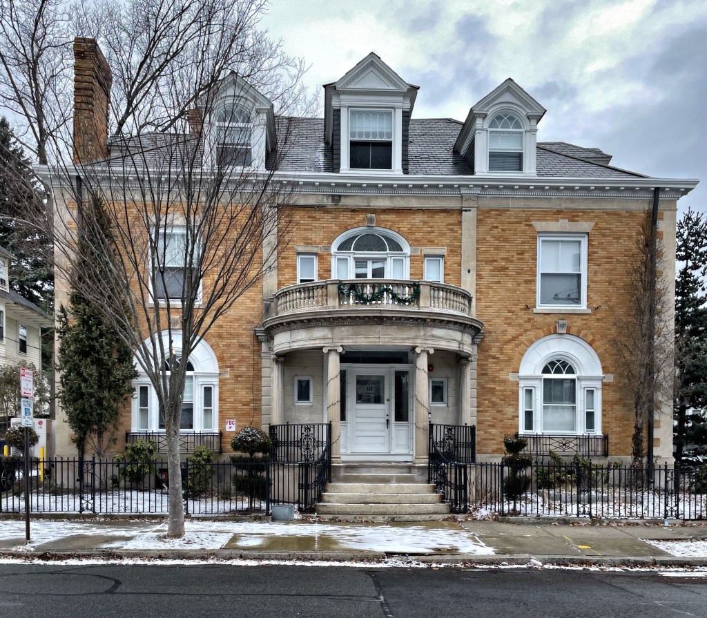 This handsome yellow brick building, designed by architects, Shaw and Hunnewell, was completed in 1895 as the Boston Free Hospital for Women. The hospital was organized in 1875 in a converted rowhouse in Boston’s South End, and after relocating once, it was decided that a purpose-built hospital was needed for the growing demands of the institution. A site in Brookline on the Muddy River, overlooking Frederick Law Olmsted’s Riverway and Olmsted Park, was purchased and the hospital was opened in 1895. The brick and limestone hospital building is somewhat Chateauesque in style and when opened, had no electricity and no telephone. The hospital is historically significant as the first teaching hospital for Harvard and as the first hospital in the country to apply radiation treatment for cancer, along with being a major research facility in fertility, especially the work of Dr. John Rock (who lived nearby) on the development of the birth control pill and research on in-vitro fertilization. The Free Hospital for Women merged with the Boston Lying In